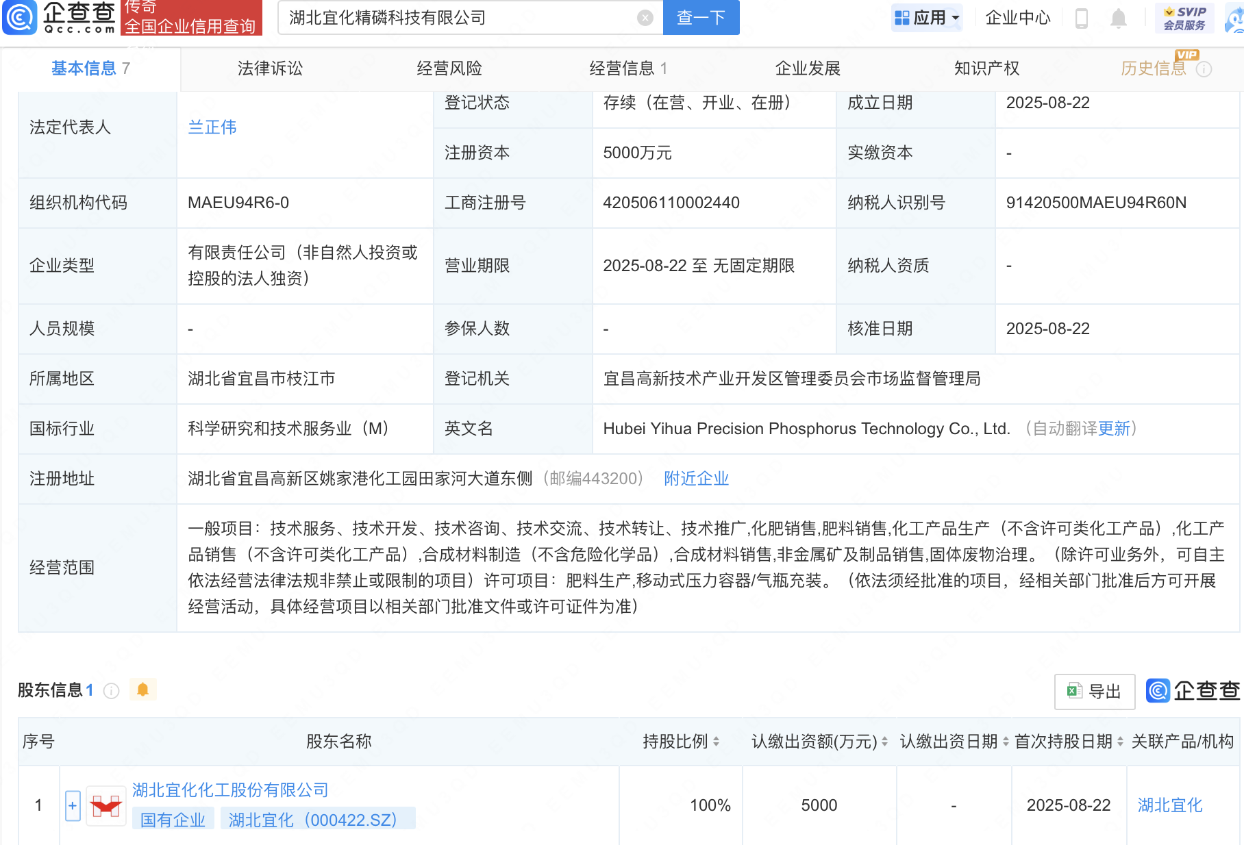 近日,湖北宜化精磷科技有限公司成立,注册资本5000万元,经营范围包含:合成材料销售;非金属矿及制品销售;固体废物治理等。企查查股权穿透显示,该公司由湖北宜化(000422)全资持股。